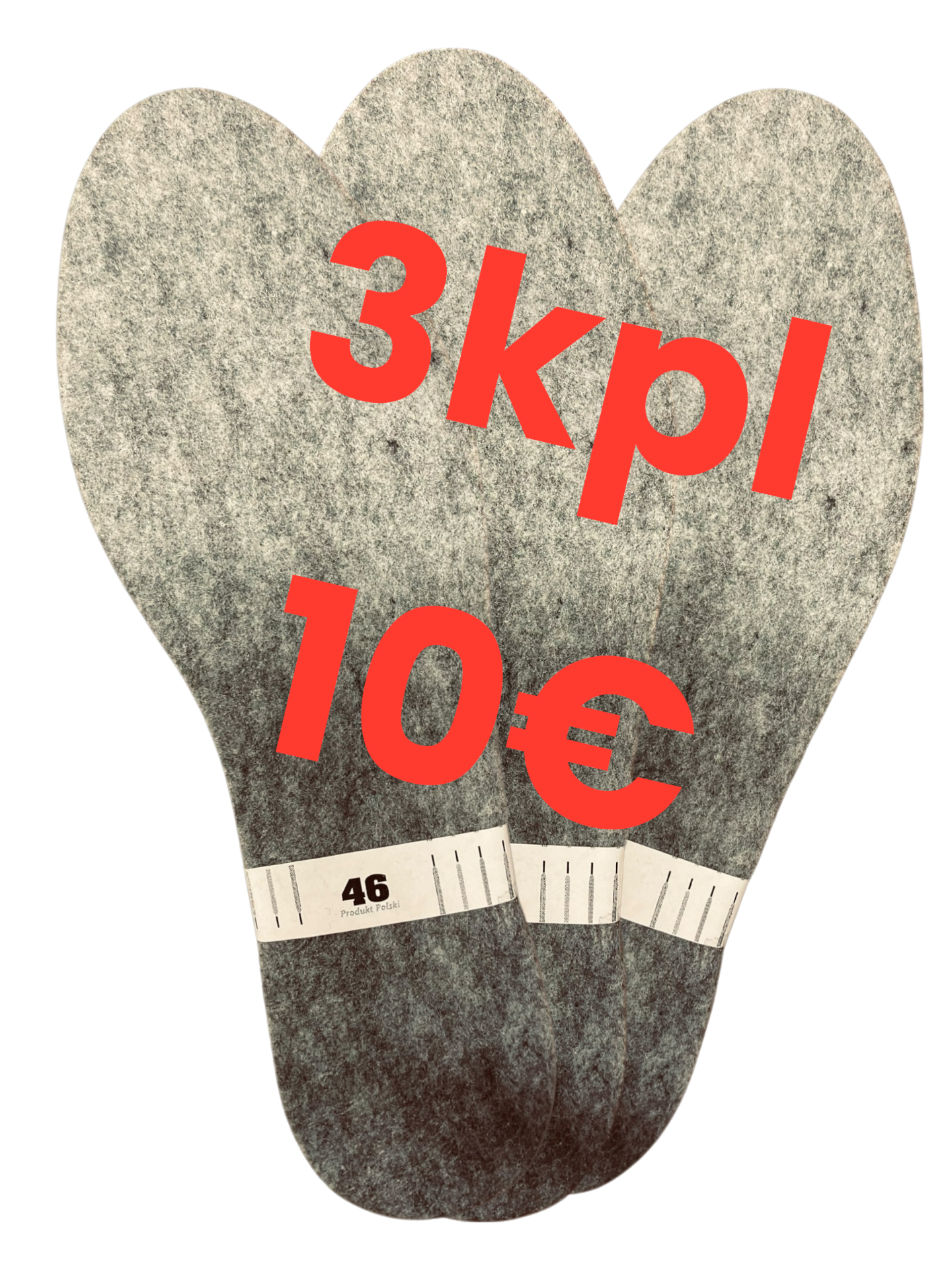Tämä lämpöpuristetu villapohjallinen kannattaa asentaa joka kenkään, saappaista tennareihin! Tekee kylmästäkin kengästä lämpöisen ja kovasta pohjasta pehmoisen. Eikä kengässä tarvihte olla mitään vikaa, mutta huomaat eron. Vinkki vitonen: Laita pohjallinen ensin vain toiseen kenkään päiväksi...illalla voit miettiä, tarviiko näitä! Tämä pohjallinen ei pienennä kenkää, paksuus on 5mm ja painuu kasaan, kun laitat jalan kenkään, mutta ei mene jalan matkassa kengän kärkeen ruttuun. Koko on suomalainen. Jos tilaat maihariin tai saappaaseen, ota numeroa isompi, niissä lesti leveämpi ja pituuden voit leikata saksilla. Voit käyttää vanhaa pohjallista mallina! Ota vanha pohjallinen, piirrä tähän pohjalliseen kuva ja leikkaa saksilla mieleinen. Pitää saappaissa jalat kuivina ja illalla voit heittää pohjalliset kuivumaan/raikastumaan yöksi. Käyttöikä 1-6kk.